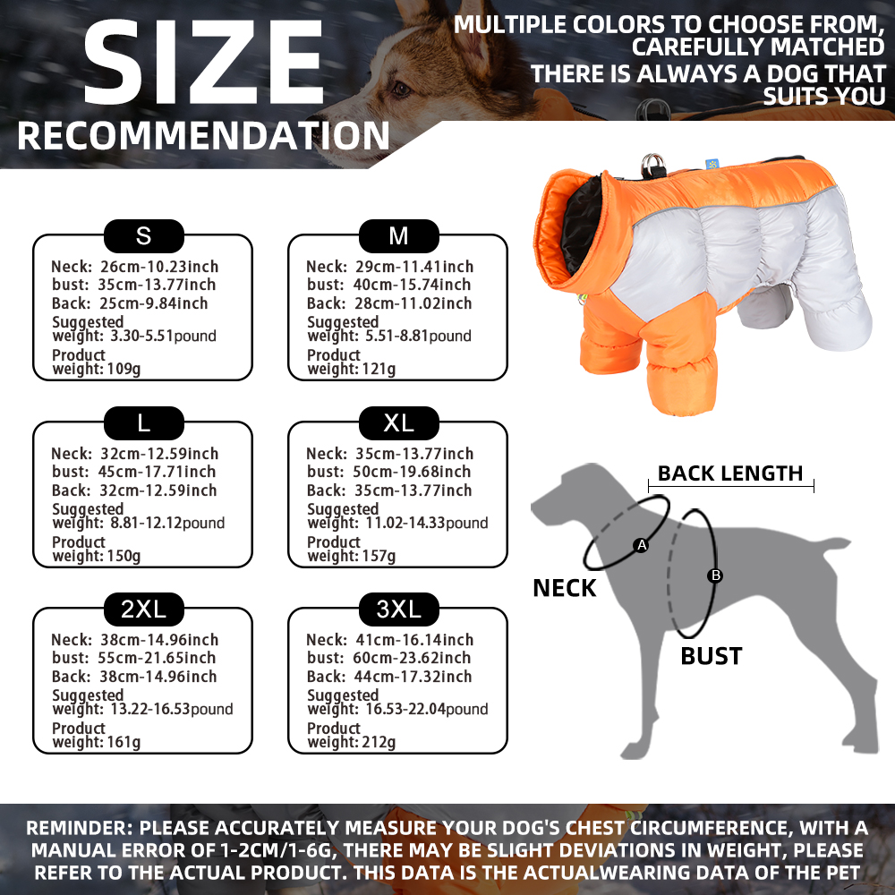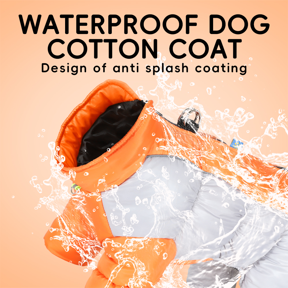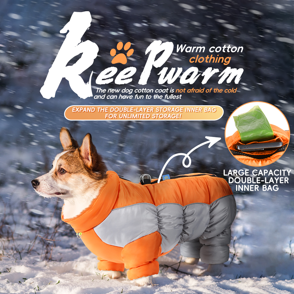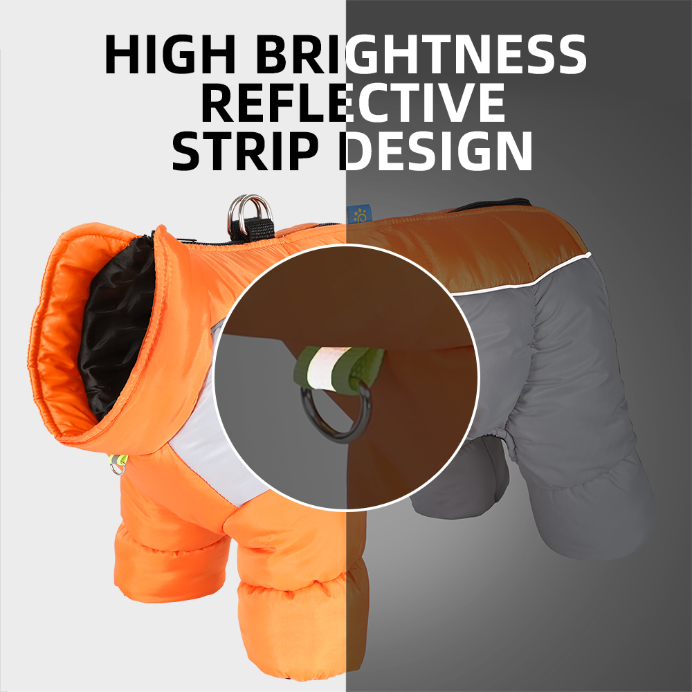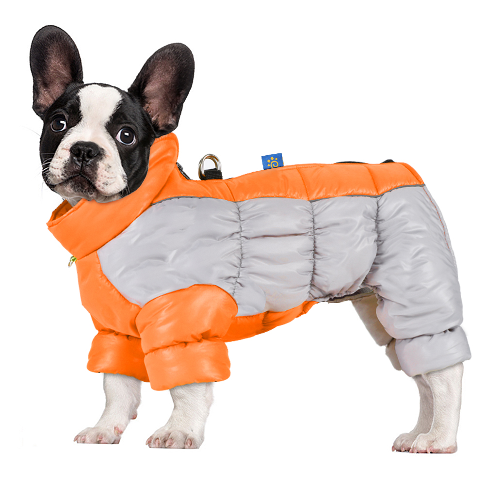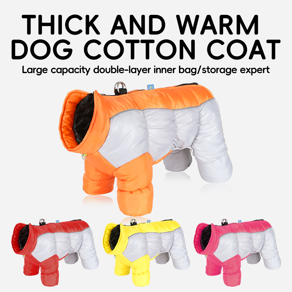 Waterproof reflective four-legged dog coat with thick insulation and warmth. Pet jacket with a leash hook